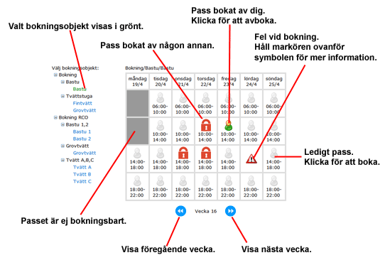 Upptagna tider visas med ett hänglås. Håller du muspekaren över hänglåset visas en liten dialogruta med vilket objekt som har bokat passet.