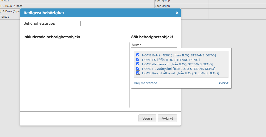 Sök upp behörigheter som ska inkluderas och välj. Klicka på Spara.