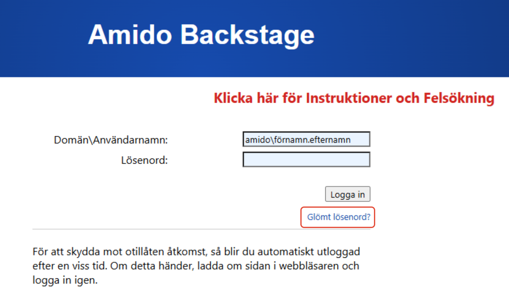 1. Klicka på "Glömt lösenord?" knappen på backstage.amido.se