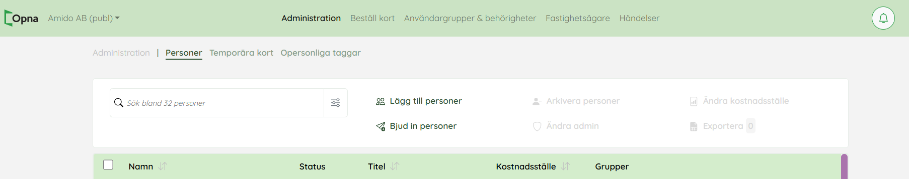För att lägga till en person som ska få ett opnakort klickar du på ”Administration” högst upp i menyraden. Du kan sen välja att lägga till personer manuellet genom ”Lägg till personer” alternativt klicka på "Bjud in personer".