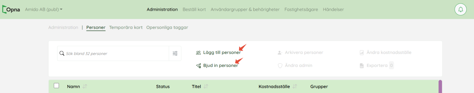 I början kommer bara du som registrerat bolaget ligga med i opna och nu är det dags för dig att lägga till flera personer som så småningom ska få ett opnakort. Vill du att fler personer ska bli administratörer i opna behöver även de läggas med här. Se hur du gör någon till administratör här