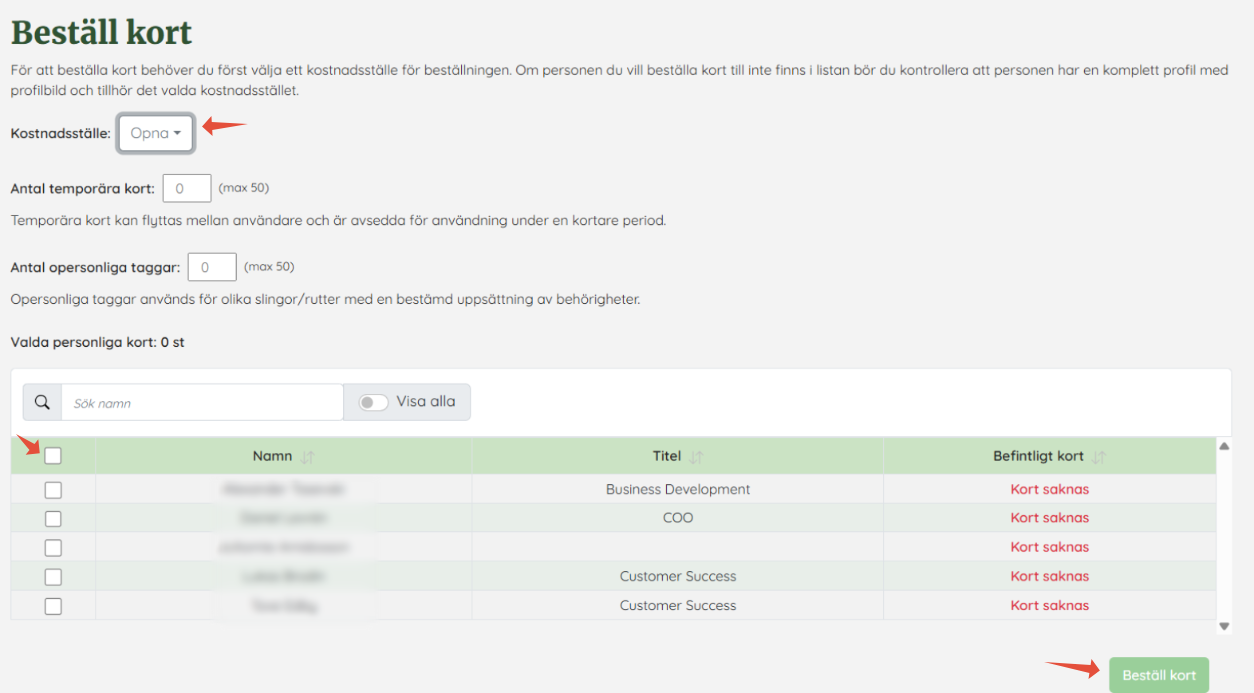 2. Välj först kostnadsställe och markera sedan personerna som skall få kort klicka vidare på "Beställ kort". Om ett kort inte går att beställa beror det troligen på att användarprofilen inte är komplett. Det kan t.ex. saknas bild eller e-postadress användarprofilen. De kort som är klara att beställa visas i listan. Har personen inget kort sen tidigare så står det "kort saknas". Du kan även beställa temporära kort. Läs mer om vad ett temporärt kort är här.