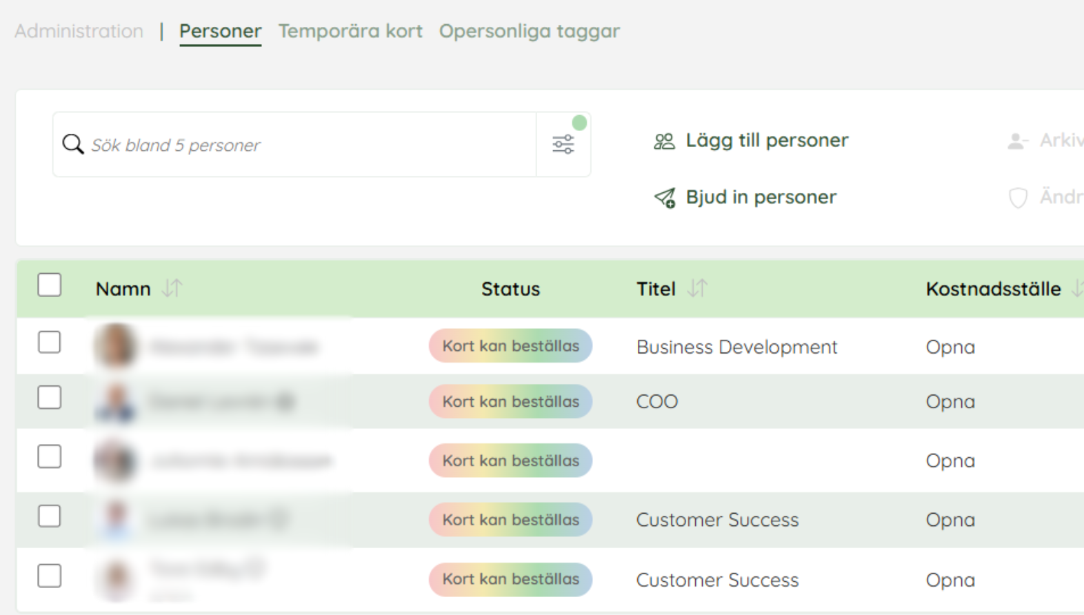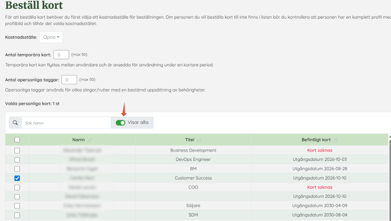 Har personen ett befintligt kort vars giltighetstid håller på att löpa ut, så kan det vara en bra idé att beställa ett kort till dom. Om det är mindre än 30 dagar tills att kortets giltighetstid löper ut så dyker personen upp i listan. Vill du beställa ett kort vars utgångsdatum sträcker sig över 30 dagar kan du klicka på "Visa alla". Då får du fram information om utgångsdatum och kan även beställa nya kort till dom om så önskas.