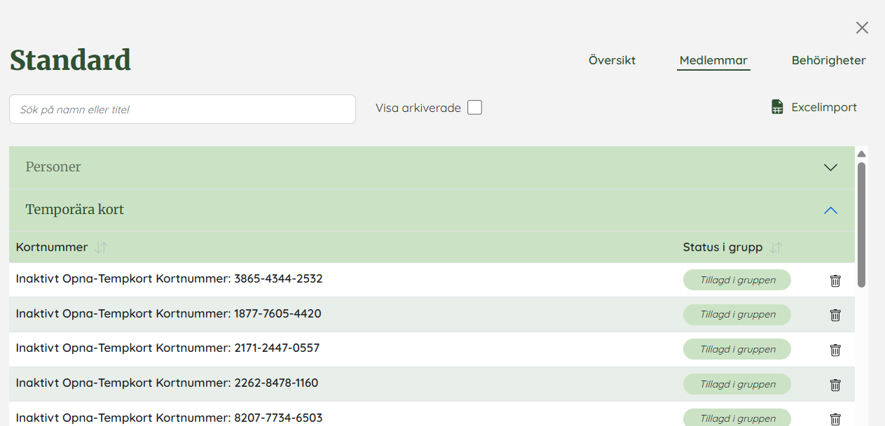 Du hanterar de temporära kortet under "användargrupper och behörigheter" och under fliken "Medlemmar" och "temporära kort". Ett temporärt kort måste ligga med i en användargrupp som har en behörighet för att fungera.