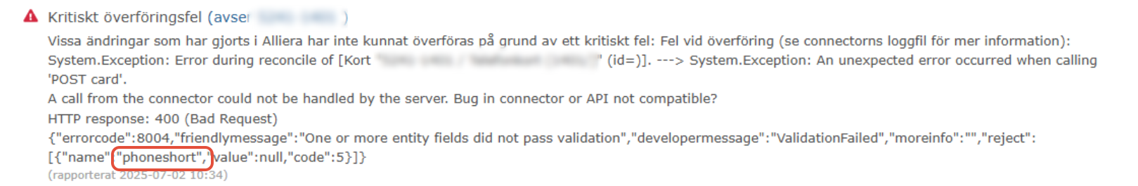 Förklaring: En kortkrock - numret på taggen som Alliera försöker skicka ner finns redan i passersystemet, vilket inte accepteras och orsakar ett fel.